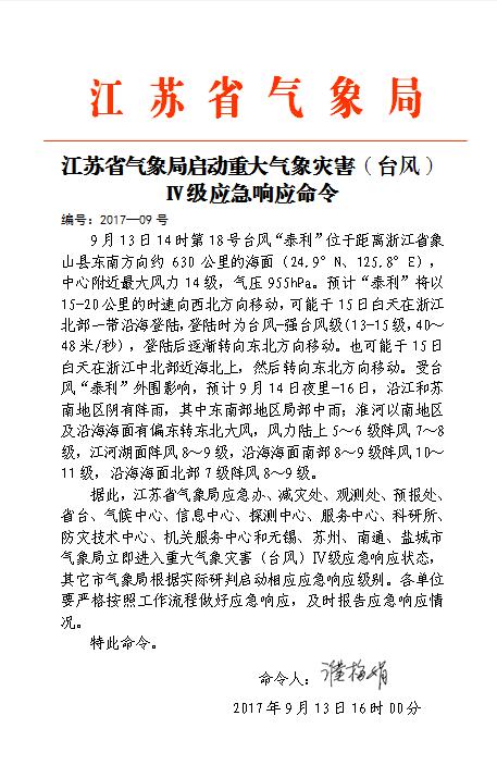 无锡防雷检测---江苏省气象局启动重大气象灾害(台风)Ⅳ级应急响应命令